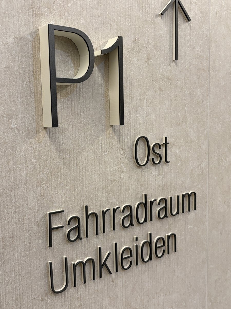Im Zuge der Erstbeschilderung wurde ein umfassendes Leitsystem entwickelt, das alle relevanten Bereiche des Gebäudes erschließt. Die Umsetzung erfolgt dabei fortlaufend im Rahmen der Projektentwicklung.